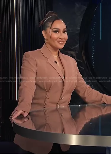 Adrienne Houghton on E! News on E! was spotted wearing this camel lace-up blazer on E! News on Mar 15 2023's episode. Adrienne's Jacket is the Maverick Lace-Up Jacket by A.L.C..