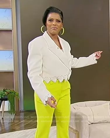Tamron Hall on Tamron Hall Show on ABC was spotted wearing this white crystal heart hem blazer on Tamron Hall Show on Mar 23 2023's episode. Tamron's Blazer is the Crystal Hearts Cropped Wool Blazer by Mach and Mach . Tamron's Pants is the Crop Flare Trousers by Proenza Schouler.