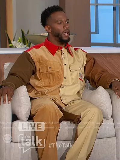 on The Talk on CBS was spotted wearing this colorblock suede jacket and pants on The Talk on Mar 23 2023's episode. 's Jacket is the x Carhartt cotton shirt by Marni . 's Pants is the Marni x Carhartt WIP Paneled Cotton Pants by Marni.