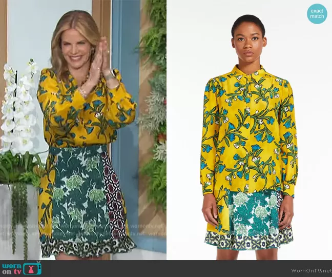 Natalie Morales on The Talk on CBS was spotted wearing this yellow floral print blouse and skirt on The Talk on Mar 23 2023's episode. Natalie's Top is the Epopea Painterly Floral Blouse by Weekend Max Mara . Natalie's Skirt is the Kiens Pleated Patchwork Skirt by Weekend Max Mara.