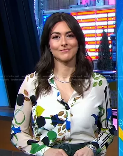 Erielle Reshef on Good Morning America on ABC was spotted wearing this white printed blouse on Good Morning America on Mar 23 2023's episode. Erielle's Top is the Jura Abstract Floral Blouse by Reiss . Erielle's Skirt is the Cape Skirt with Belt by Zara.