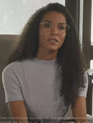 (played by ) on Grand Crew on NBC was spotted wearing this Blue ribbed short sleeve sweater on Grand Crew on episode 'Wine & Therapy' (1x04) in Jan 2022. 's Sweater is the Short Sleeve Rib Cashmere Sweater by Club Monaco.