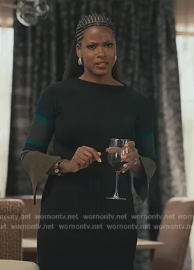 Vivian Banks (played by Cassandra Freeman) on Bel-Air on Peacock was spotted wearing this black contrast stripe top and skirt on Bel-Air on episode 'Excellence Is Everywhere' (2x05) in Mar 2023. Viv's Top is the Stratum striped three-quarter sleeve top by CFCL . Viv's Skirt is the Black Fluted Skirt by CFCL.