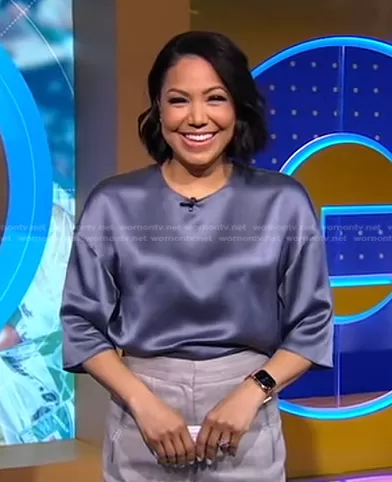 Stephanie Ramos on Good Morning America on ABC was spotted wearing this purple elbow sleeve satin top on Good Morning America on Mar 24 2023's episode. Stephanie's Top is the Silk Short Sleeve T-Shirt by Vince.