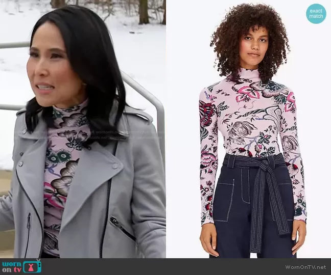 Vicky Nguyen on Today on NBC was spotted wearing this pink floral top and grey moto jacket on Today on Mar 24 2023's episode. Vicky's Top is the Kyra Turtleneck top in Pink Happy Times by Tory Burch . Vicky's Jacket is the Fern Leather Biker Jacket by All Saints.