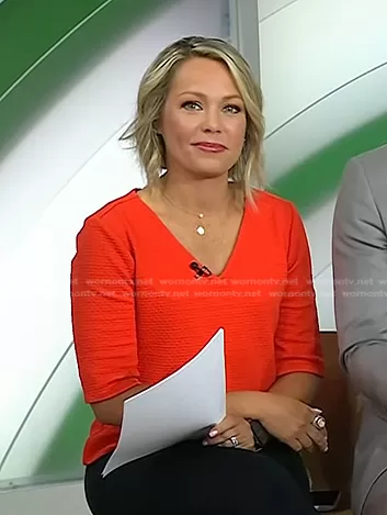 Dylan Dreyer on Today on NBC was spotted wearing this red textured elbow sleeve top on Today on Aug 17 2023's episode. Dylan's Top is the Textured 3/4 Sleeve Sweater in bright orange by Ann Taylor.
