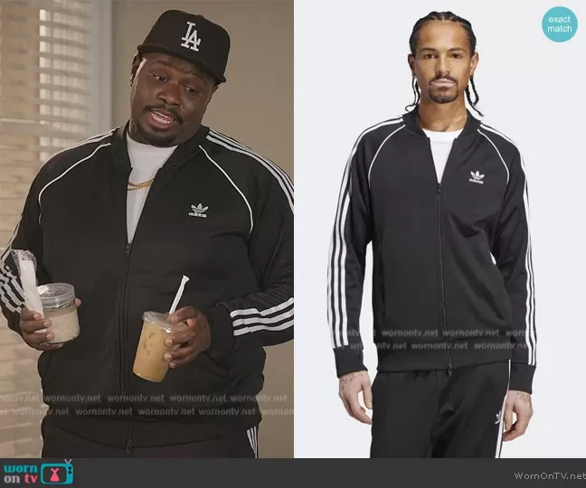 Sherm Jones (played by Carl Tart) on Grand Crew on NBC was spotted wearing this black Adidas jacket on Grand Crew on episode 'Wine & Hip Hop' (1x05) in Jan 2022. Sherm's Jacket is the Adicolor Track Jacket by Adidas.