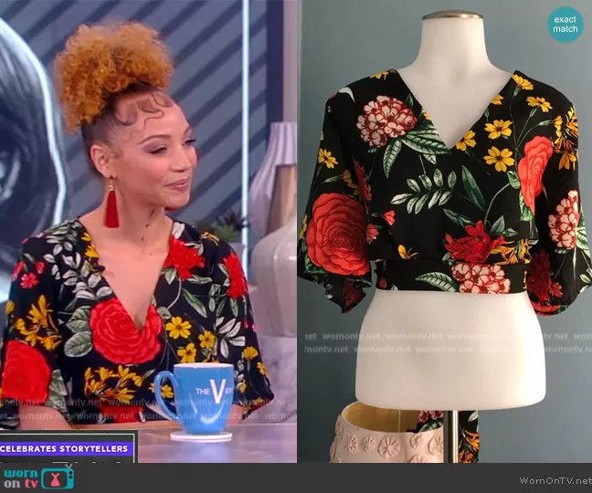 on The View on ABC was spotted wearing this Justina Miles’ black floral print top on The View on Mar 27 2023's episode. 's Top is the Crop Top by Charlotte Russe.