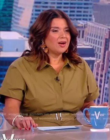 Ana Navarro on The View on ABC was spotted wearing this khaki belted midi dress on The View on Mar 27 2023's episode. Ana's Dress is the Upland Belted Midi Shirt Dress by Lafayette 148 New York.