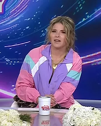 Jenna Bush Hager on Today on NBC was spotted wearing this pink and purple colorblock jacket on Today on Mar 24 2023's episode. Jenna's Jacket is the Lightweight Color Block Bomber Jacket by SweatyRocks at Amazon.