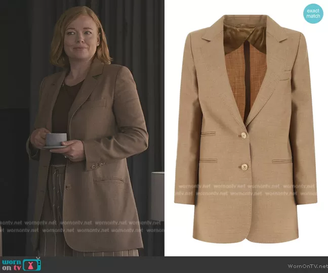 Shiv Roy (played by Sarah Snook) on Succession on HBO was spotted wearing this beige blazer and pants on Succession on episode 'The Munsters' (4x01) in Mar 2023. Shiv's Blazer is the Riviera Blazer by Max Mara . Shiv's Pants is the Calabra Silk Wide Leg Pants by Max Mara . Shiv's Sunglasses is the Broadway Sunglasses by Garrett Leight . Shiv's Bag is the Calella Tote bag by Hereu .
