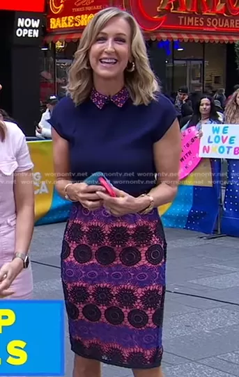 Lara Spencer on Good Morning America on ABC was spotted wearing this navy lace dress on Good Morning America on May 17 2024's episode. Lara's Dress is the Lace Mix Cocktail Dress by French Connection.