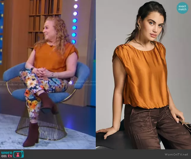 on Good Morning America on ABC was spotted wearing this orange top and floral pants on Good Morning America on Mar 27 2023's episode. 's Top is the Silky Scoop Blouse by Anthropologie . 's Pants is the Floral Trousers by Moxy Collective.