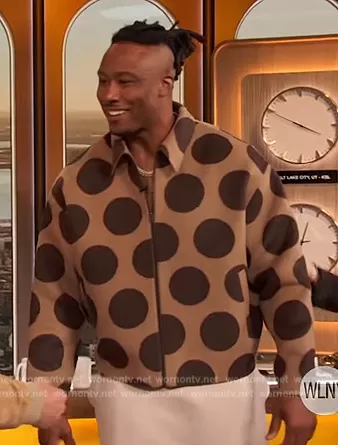 on The Drew Barrymore Show on CBS was spotted wearing this brown polka dot jacket on The Drew Barrymore Show on Mar 24 2023's episode. 's Jacket is the Doverio Double Polka Dot Jacket by Acne Studios.