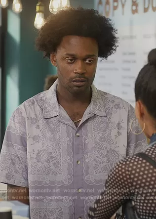 Noah Koles (played by Echo Kellum) on Grand Crew on NBC was spotted wearing this blue paisley print shirt on Grand Crew on episode 'Wine & Pie' (1x06) in Jan 2022. Noah's Shirt is the Paisley Print Shirt by BDG.