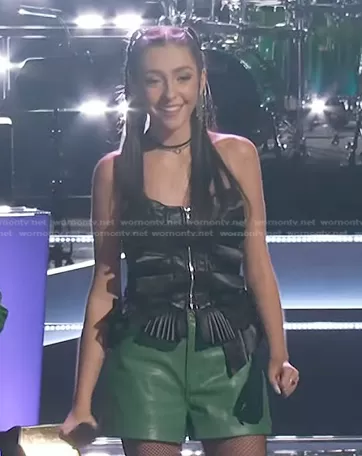 on The Voice on NBC was spotted wearing this black ruffled leather zip top on The Voice on Mar 26 2023's episode. 's Top is the Make a Movie Faux Leather Ruffle Tube Top by Akira.