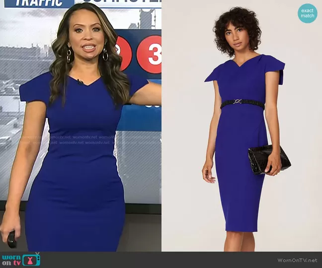 Adelle Caballero on Today on NBC was spotted wearing this blue v-neck sheath dress on Today on Mar 28 2023's episode. Adelle's Dress is the Chafford Dress by Roland Mouret.