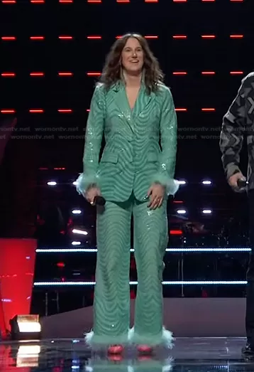 on The Voice on NBC was spotted wearing this sequin feather cuff blazer and pants on The Voice on Mar 28 2023's episode. 's Jacket is the Feather Trim Marble Sequin Blazer by Nasty Gal . 's Pants is the Marble Print Tailored Pants With Feather Trims by Nasty Gal.