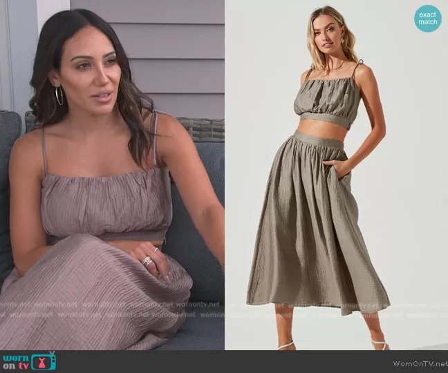 Melissa Gorga on The Real Housewives of New Jersey on Bravo was spotted wearing this top and pants on The Real Housewives of New Jersey on episode 'Pizza Gate' (13x08) in Mar 2023. Melissa's Top is the Terra Bella Top by ASTR the Label . Melissa's Skirt is the Terra Bella Midi Skirt by ASTR the Label . Melissa's Shoes is the Clarita bow-embellished suede wedge sandals by Alexandre Birman . Melissa's Bag is the Saddle Bag with Strap by Dior.