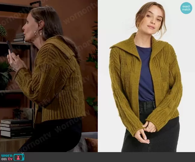 Lucy Coe (played by Lynn Herring) on General Hospital on ABC was spotted wearing this olive green knit cardigan on General Hospital on Mar 29 2023's episode. Lucy's Sweater is the Open Layering Cardigan in Green by Universal Thread at Target.
