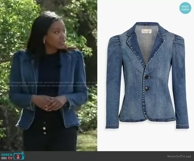 Rachel Scott on Good Morning America on ABC was spotted wearing this puff sleeve denim jacket on Good Morning America on Mar 29 2023's episode. Rachel's Jacket is the Rowen Pleated Denim Jacket by Nili Lotan.