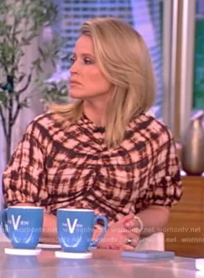 Sara Haines on The View on ABC was spotted wearing this plaid ruched dress on The View on Mar 29 2023's episode. Sara's Dress is the Tie-Dye Cinched Dress by Proenza Schouler.