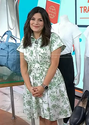 Adrianna Barrionuevo Brach on Today on NBC was spotted wearing this white and green floral belted dress on Today on May 17 2023's episode. Adrianna's Dress is the Printed Cotton Minidress by Rachel Parcell.