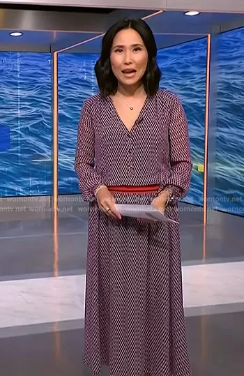 Vicky Nguyen on NBC News Daily on NBC was spotted wearing this purple geometric print dress on NBC News Daily on Jan 08 2024's episode. Vicky's Dress is the Velma Silk Dress by Tory Burch.