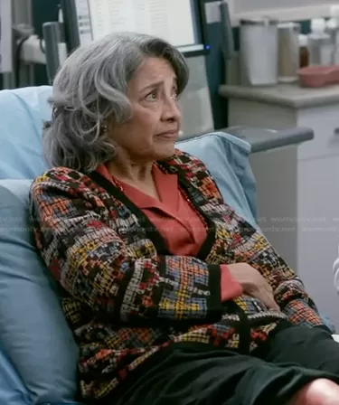 Norma (played by Olivia Negron) on Greys Anatomy on ABC was spotted wearing this mixed print jacket on Greys Anatomy on episode 'Pick Yourself Up' (19x12) in Mar 2023. 's Sweater is the Multicolor Linen Cardigan by Pendleton.