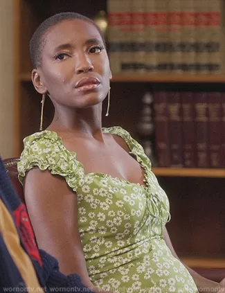 (played by Ashleigh Morghan) on Grand Crew on NBC was spotted wearing this green floral print ruffle mini dress on Grand Crew on episode 'Wine & Labels' (2x02) in Mar 2023. 's Dress is the Pacey Dress by Reformation.