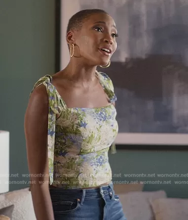 (played by Ashleigh Morghan) on Grand Crew on NBC was spotted wearing this green floral print tie shoulder top on Grand Crew on episode 'Wine & Labels' (2x02) in Mar 2023. 's Top is the Ellora Top by Reformation.