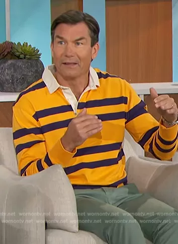 Jerry O'Connell on The Talk on CBS was spotted wearing this yellow stripe rugby shirt on The Talk on episode 'Wine & Labels' (2x02) in Mar 2023. Jerry's Shirt is the Rugby Stripe Polo Shirt by J. Crew.