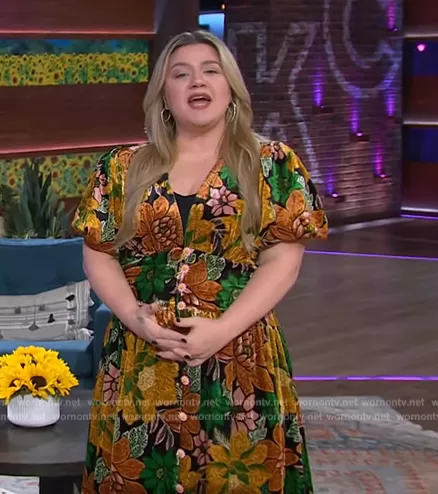 Kelly Clarkson on The Kelly Clarkson Show on NBC was spotted wearing this floral v-neck dress on The Kelly Clarkson Show on Mar 31 2023's episode. Kelly's Dress is the Black Garden V Neck Midi Dress by Farm Rio.