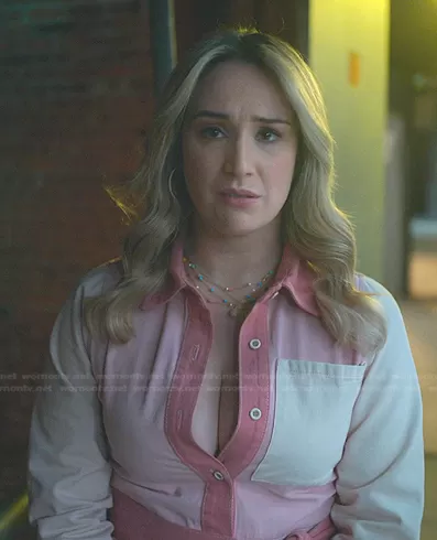 Davia (played by Emma Hunton) on Good Trouble on Freeform was spotted wearing this pink colorblock shirtdress on Good Trouble on episode 'I Gotta Feeling' (5x05) in Apr 2023. Davia's Dress is the Color Block Pocket Detail Shirt Dress in pink by In The Style x Dani Dyer.
