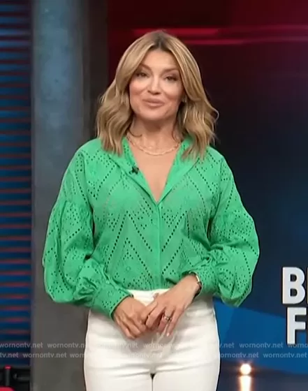 Kit Hoover on Access Hollywood on NBC was spotted wearing this green eyelet blouse on Access Hollywood on Nov 04 2023's episode. Kit's Top is the Embroidered Shirt by Maje.