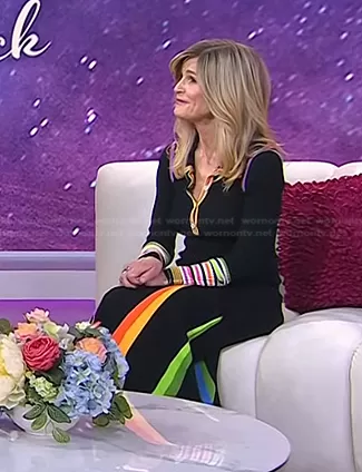 on Today on NBC was spotted wearing this rainbow striped polo dress on Today on Mar 31 2023's episode. 's Dress is the Pleated Striped Ribbed Wool Maxi Dress by Christopher John Rogers.