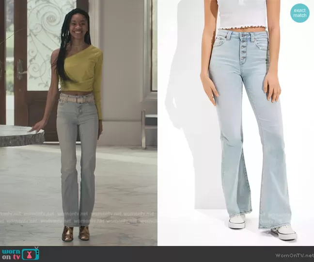 Ashley Banks (played by Akira Akbar) on Bel-Air on Peacock was spotted wearing this denim jeans on Bel-Air on episode 'Let the Best Man Win' (2x06) in Mar 2023. Ashley's Pants is the Next Level Super High Waited Flare Jeans by American Eagle.