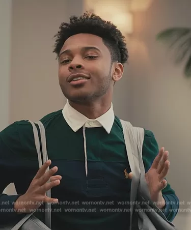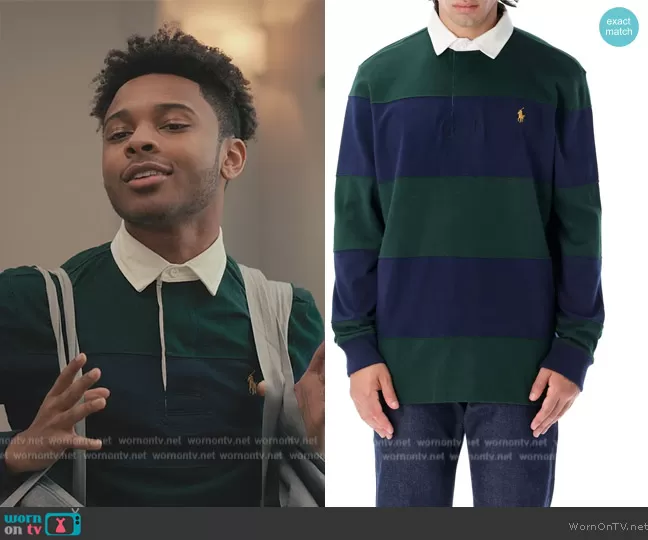 (played by Amarr) on Bel-Air on Peacock was spotted wearing this rugby polo shirt on Bel-Air on episode 'Let the Best Man Win' (2x06) in Mar 2023. 's Shirt is the Striped Long-Sleeved Polo Shirt by Ralph Lauren.