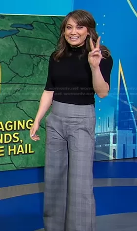 Ginger Zee on Good Morning America on ABC was spotted wearing this grey plaid wide-leg pants on Good Morning America on Mar 31 2023's episode. Ginger's Pants is the High Waist Wide Leg Pants by Kira Grace.