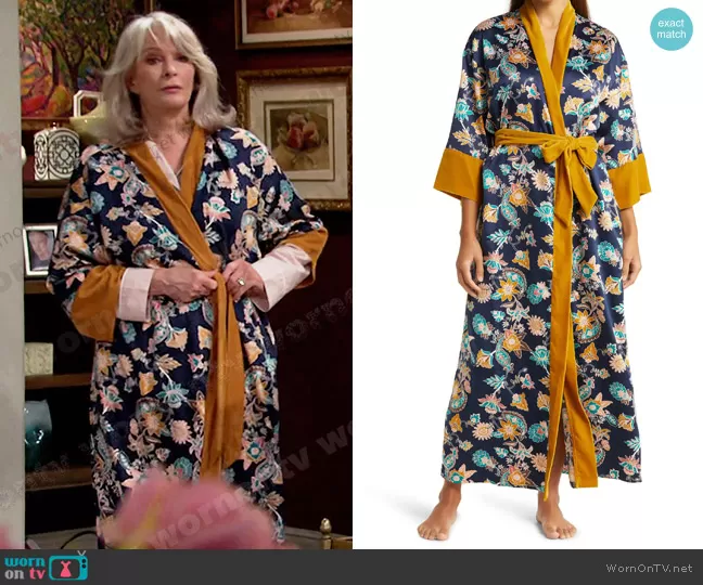 Marlena Evans (played by Deidre Hall) on Days of our Lives on Peacock was spotted wearing this navy floral robe on Days of our Lives on Apr 03 2023's episode. Marlena's Robe is the Velveteen Trim Satin Robe by Nordstrom.