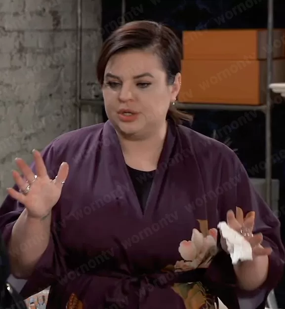 Maxie Jones (played by Kirsten Storms) on General Hospital on ABC was spotted wearing this purple floral robe on General Hospital on May 12 2023's episode. Maxie's Robe is the Charmeuse Kimono Robe Long in Peony Butterfly Plum by Kim + Ono .