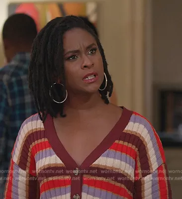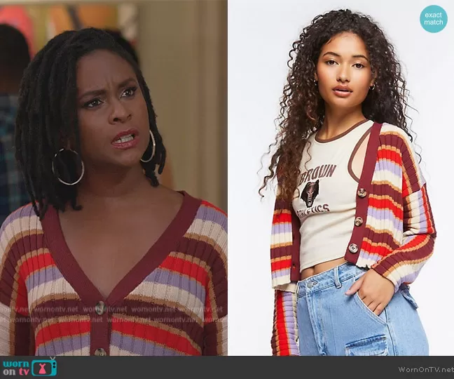 (played by ) on Grand Crew on NBC was spotted wearing this Stripe ribbed cardigan on Grand Crew on episode 'Wine & Neighbors' (2x03) in Mar 2023. 's Sweater is the Striped Cardigan by Forever 21.