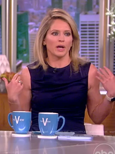 Sara Haines on The View on ABC was spotted wearing this navy satin ruched dress on The View on Apr 04 2023's episode. Sara's Dress is the Tucked Satin Crepe Sleeveless Midi Dress by Alex Perry.