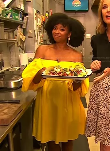 on Today on NBC was spotted wearing this yellow off-shoulder dress on Today on Apr 04 2023's episode. 's Dress is the Satin Dress in Yellow by Peter Som Collective.