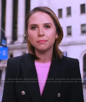 Elizabeth Schulze on Good Morning America on ABC was spotted wearing this black double breasted tweed blazer on Good Morning America on Oct 30 2025's episode. Elizabeth's Jacket is the Textured Weave Tweed Blazer by Zara.