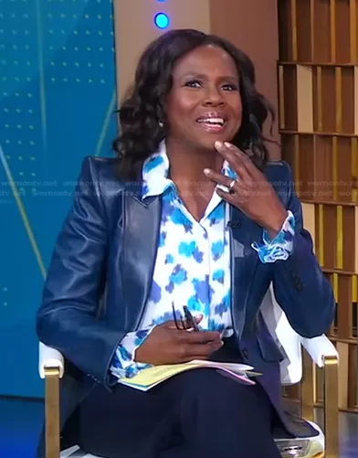 Deborah Roberts on Good Morning America on ABC was spotted wearing this printed blouse and blue leather blazer on Good Morning America on Apr 04 2023's episode. Deborah's Top is the Puff Sleeve Shirt by Carolina Herrera . Deborah's Jacket is the Fitted Leather Blazer by Alexander McQueen.