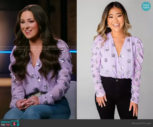 on The Voice on NBC was spotted wearing this purple sequin star embellished blouse on The Voice on Apr 07 2023's episode. 's Bodysuit is the Joan Surplice Neckline Bodysuit by Buddy Love.