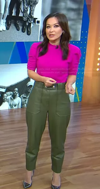 Eva Pilgrim on Good Morning America on ABC was spotted wearing this pink sweater and green leather pants on Good Morning America on Apr 05 2023's episode. Eva's Sweater is the Ruched Sleeve Cashmere-Wool Sweater in Magenta by Frame . Eva's Pants is the Atala Faux Leather Pants by Veronica Beard.