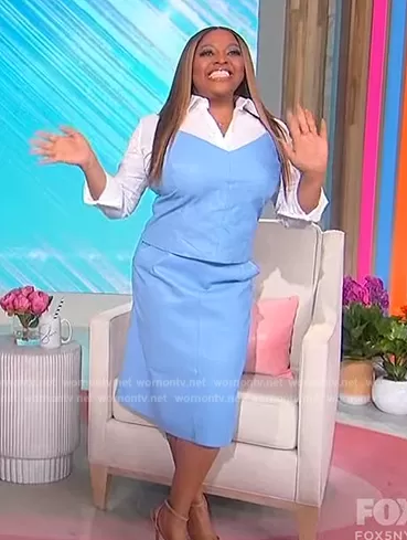 Sherri Shepherd on Sherri on FOX was spotted wearing this blue leather tank and skirt on Sherri on Apr 05 2023's episode. Sherri's Top is the Becca Recycled Leather Tank by AS by DF . Sherri's Skirt is the Becca Recycled Leather Blend Skirt by AS by DF.