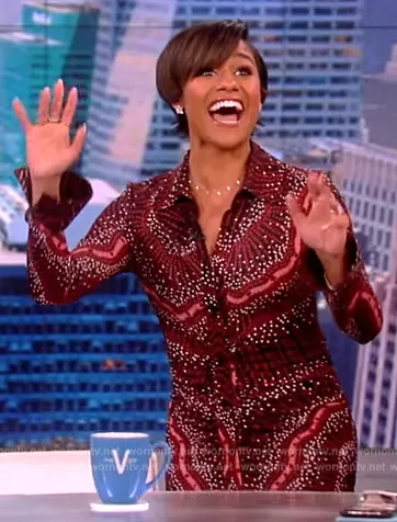 on The View on ABC was spotted wearing this burgundy printed shirtdress on The View on Apr 05 2023's episode. 's Dress is the Claudia Printed Button-Front Midi Dress by Altuzarra.
